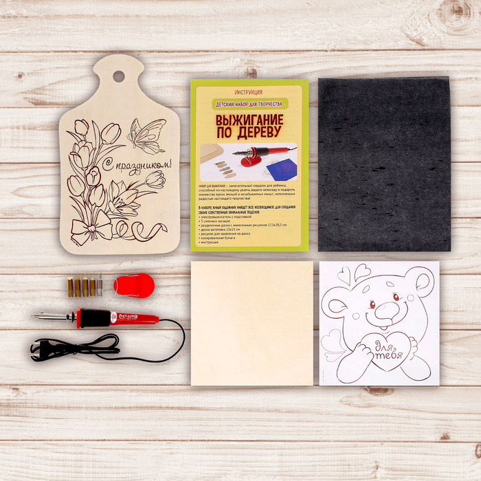 Комплект создан для тех ребятишек, кто ещё не научился самостоятельно придумывать сюжеты, но уже уверенно держит в руках прибор для выжигания. С его помощью малыш легко создаст настоящее произведение искусства на простом кусочке дерева.