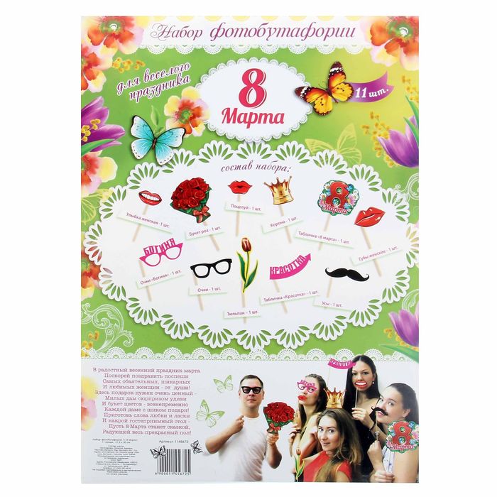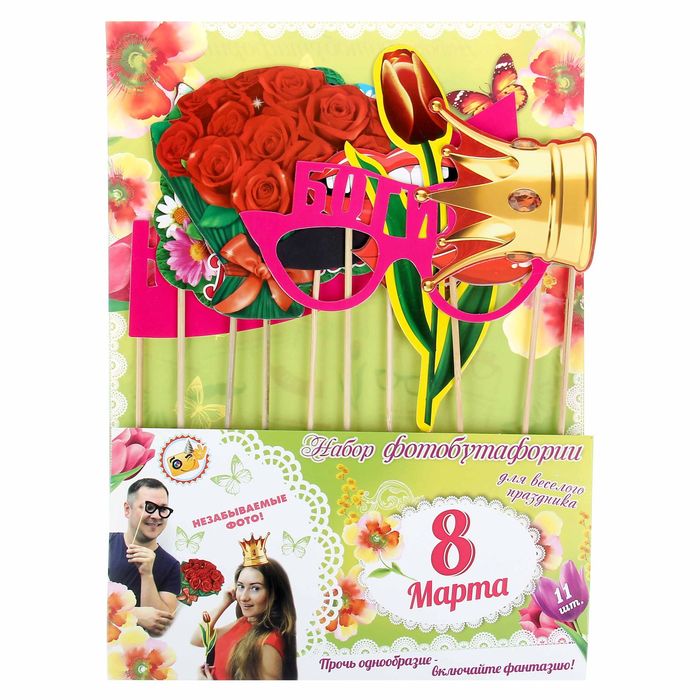 Хотите сделать самый главный женский праздник ярким и незабываемым? Набор фотобутафории «8 Марта» поможет! В него входят 11 ярких тематических предметов на деревянной ножке, которые преобразят вас до неузнаваемости.