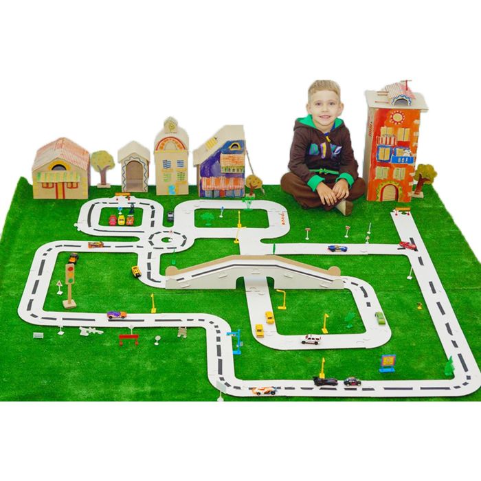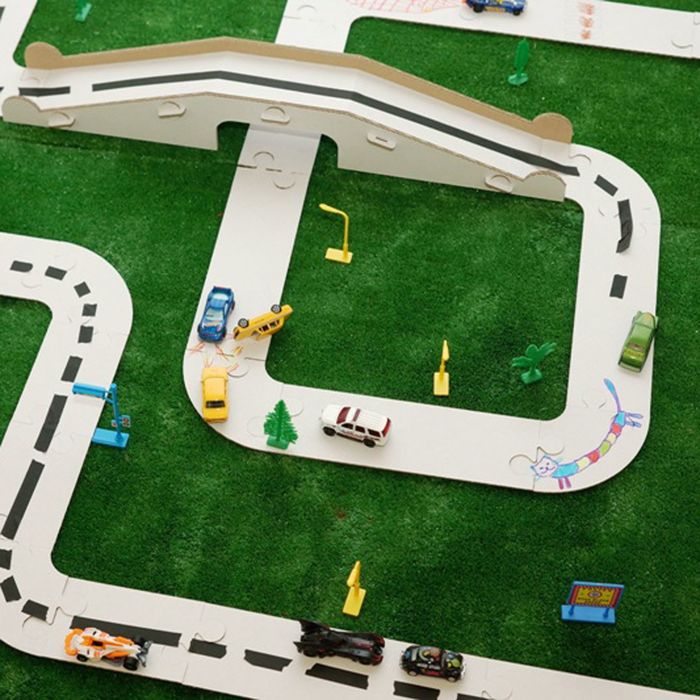 Из элементов конструктора вы можете построить 6 метров дорожного полотна с множеством поворотов или прямой путь, соединяющий две комнаты. Также в комплект входят детали для сборки эстакады, которая также станет частью вашей трассы. На пазлах из прочного трёхслойного картона вы сможете легко нанести разметку, знаки или разрисовать их как угодно с помощью красок, фломастеров или маркеров.