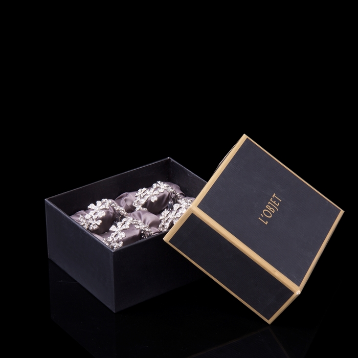 Хотите украсить праздничный стол, но не знаете, с чего начать? С колец для салфеток! Ведь именно салфетку первой берут в руки, а значит, обращают внимание на то, как она сложена, и на красоту держащего ее кольца. Набор из четырех колец серии Garland известной португальской марки L'objet просто поражает своей красотой. Изящные предметы, выполненные в виде цветков с пятью лепестками, изготовлены из меди, покрыты платиной и декорированы кристаллами Swarovski. Эти кольца станут замечательным украшением праздничного стола и подарят множество положительных эмоций как хозяевам дома, так и их гостям, ведь на стильную и элегантную вещь просто невозможно не обратить внимание.