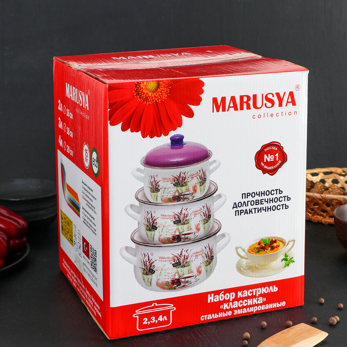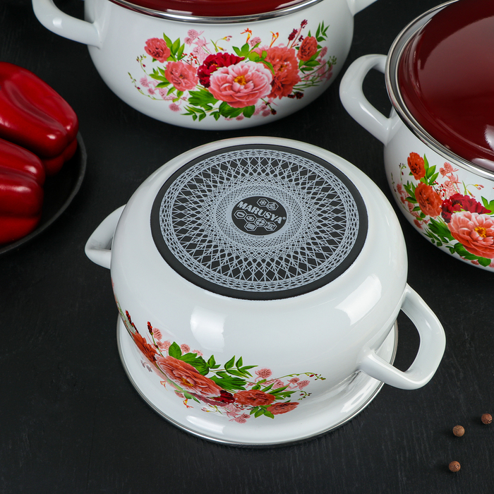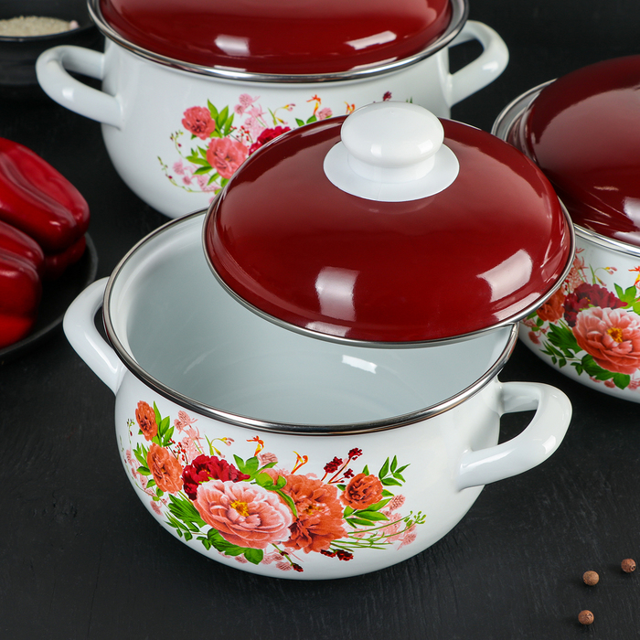 Набор кастрюль "Пионы", 3 предмета: 2 л, 3 л, 4 л, эмалированная крышка