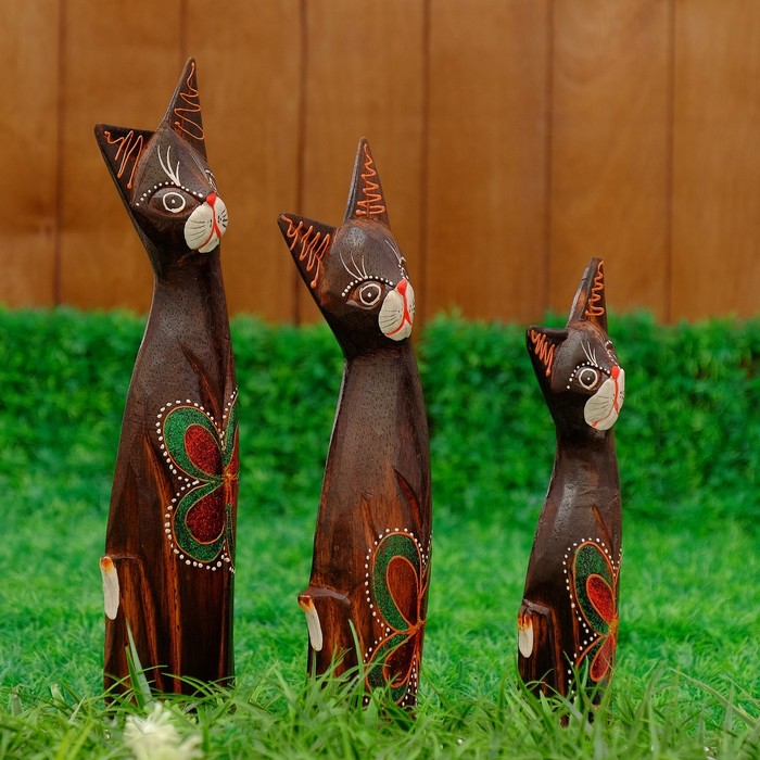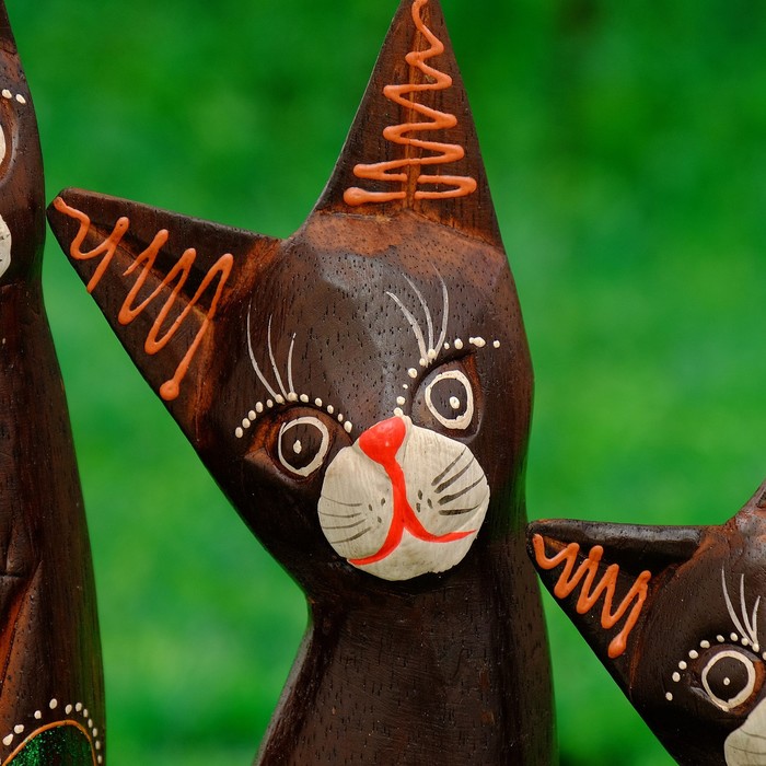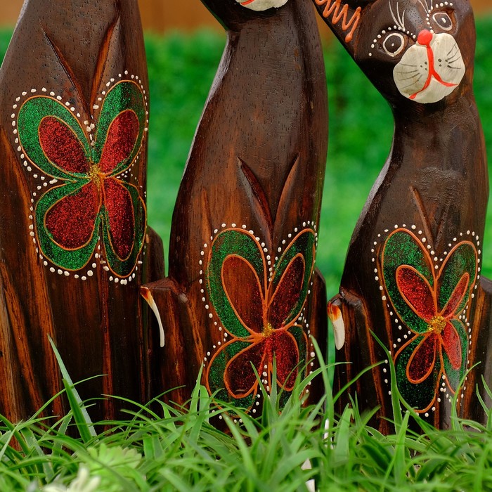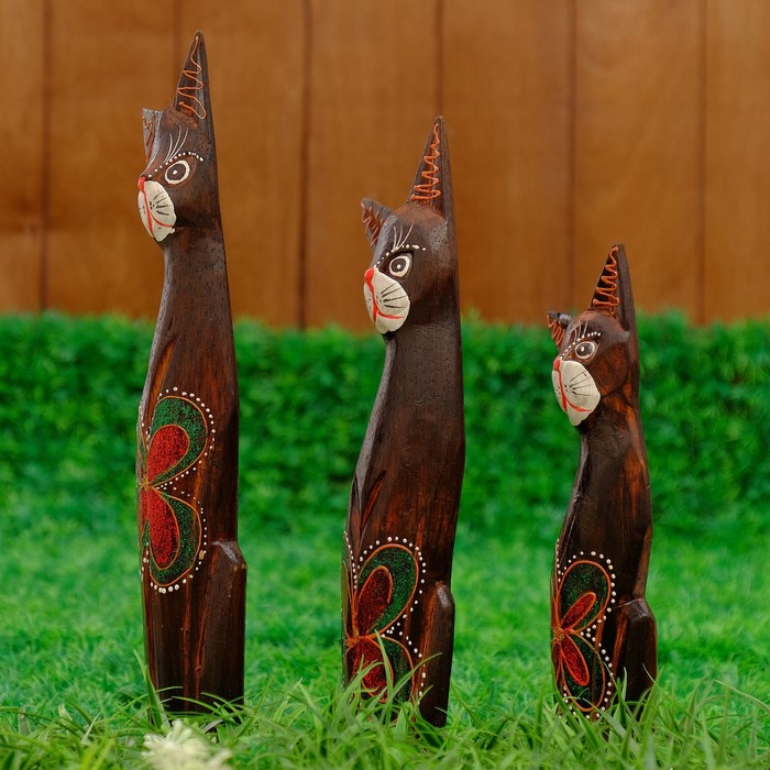 Индонезия считается «страной кошек». Индонезийский народ довольно трепетно относятся к кошкам и считают, что это домашнее животное олицетворяет любовь. Чаще всего именно кошек изображают на картинах, панно, создают удивительные статуэтки, стараясь сделать их разных цветов и форм. Набор кошек сувенирных "Кошки с цветком на брюшке", 3 шт станет актуальным подарком на любой праздник будь то свадьба или новоселье, День рождения или юбилей, ведь кошка символизирует тепло домашнего очага, грациозность, красоту и свободу.