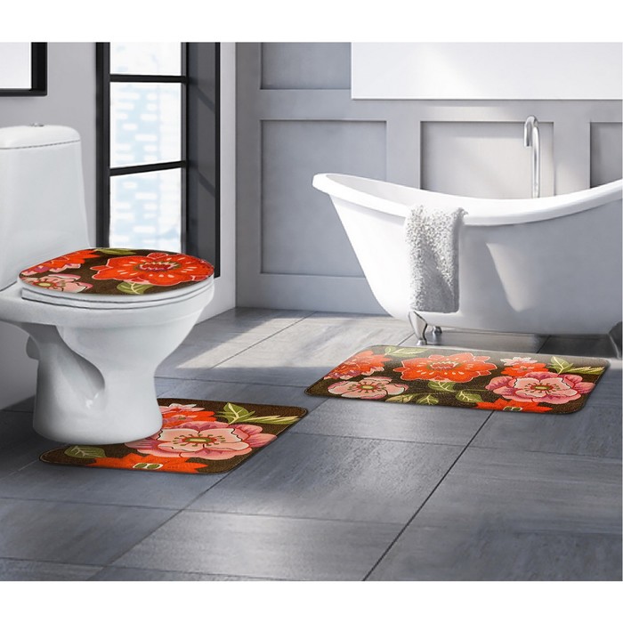 Набор ковриков для ванной и туалета "Красные цветы" 3 шт