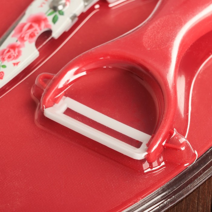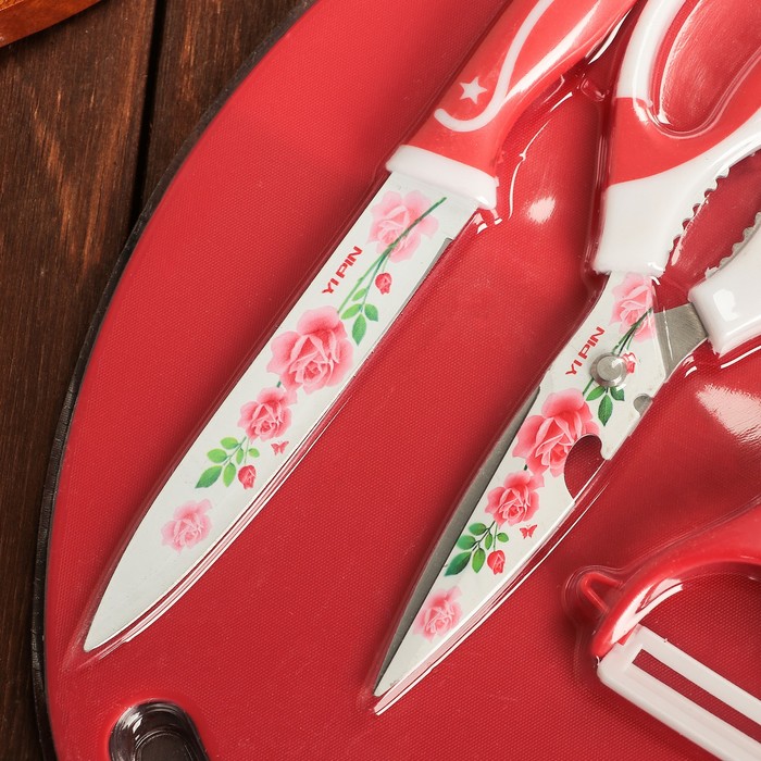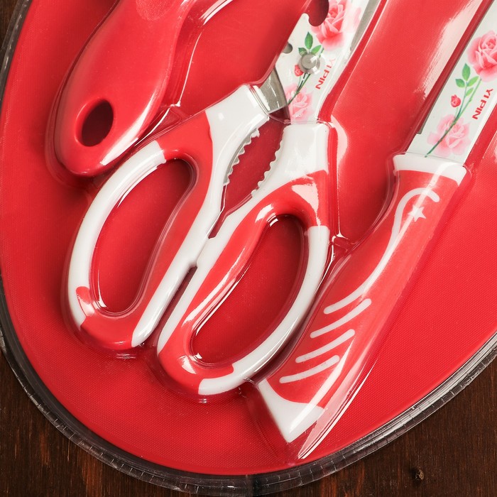 Набор кухонный, 4 предмета: нож, ножницы с антиналипающим покрытием, овощечистка, доска, цвет красный