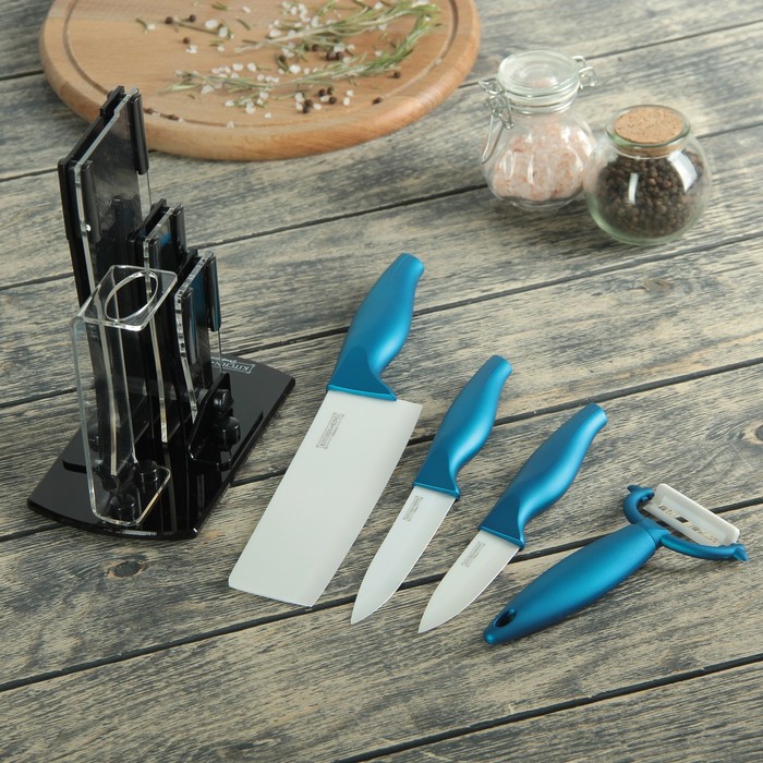 Набор "Лазурит", 4 предмета: 3 ножа 8/10/13 см, овощечистка на подставке