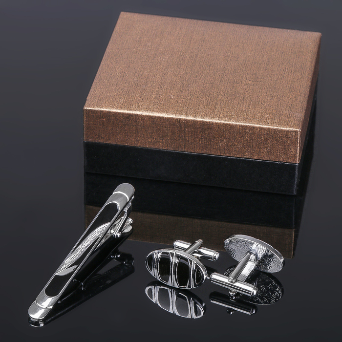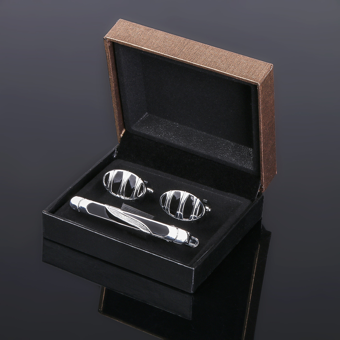 Ни один стиляга не будет выглядеть современно без искусно подобранных украшений, которые завершат его образ! Бижутерия — это современная недорогая альтернатива изделиям из золота и прочих драгоценных металлов. Набор мужской "Запонки + зажим для галстука", пуля с резьбой, цвет серебро — это то, что добавит вам шарма!