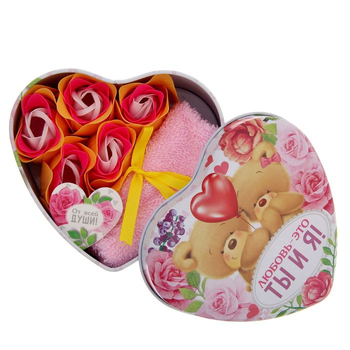 Набор мыльных лепестков в шкатулке-сердце "Любовь - это ты и я!", 5 бутонов и полотенце (20х20)