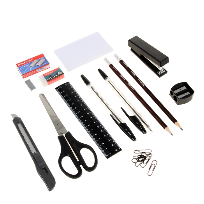Набор "Лидер" идеально подойдет для любого стола. Великолепная организация рабочего пространства осуществляется за счет устойчивой, вместительной конструкции. В комплекте: степлер № 10, 1000 скоб, 2 карандаша, 2 ручки, 30 скрепок, ластик, точилка, линейка, ножницы, нож канцелярский, блок бумаги для записей.