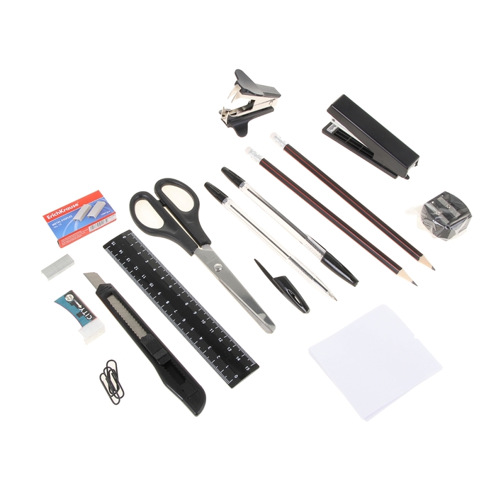 Вращающийся набор "Офисный" эффективно организует пространство на Вашем рабочем столе. Вместительный и элегантный, идеально подойдет для хранения различных канцелярских принадлежностей. В комплекте: степлер № 10, 1000 скоб, антистеплер, 2 карандаша, 2 ручки, 30 скрепок, ластик, точилка, линейка, ножницы, нож канцелярский, блок бумаги для записей.