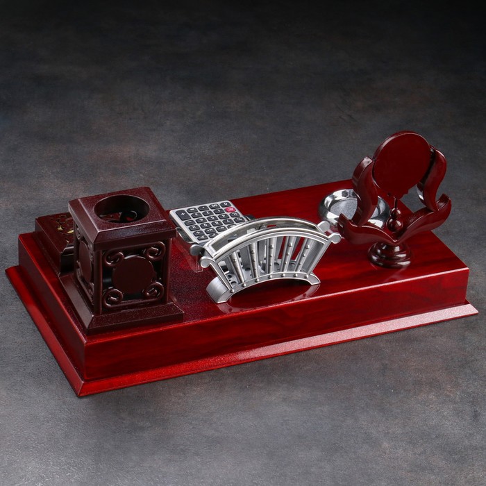 Компактный настольный набор поможет избежать хаоса на рабочем месте. Храните в нём канцелярские принадлежности или другие мелочи, чтобы правильно организовать пространство. К тому же изделие имеет минималистичный дизайн и выполнено под дерево, поэтому оно украсит собой любое место как декоративный элемент.