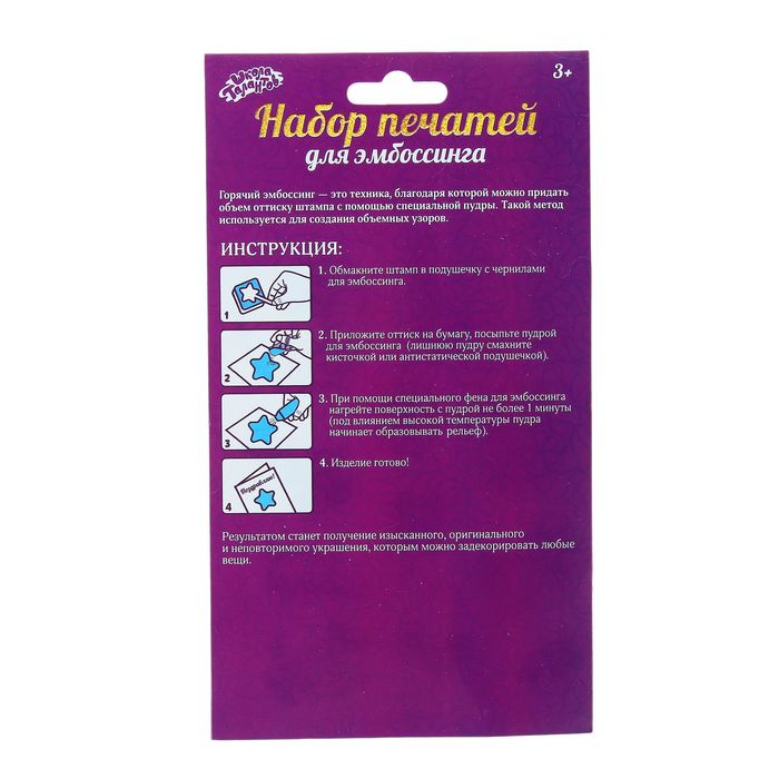 Может быть, именно такой необычный товар, как Набор печатей для эмбоссинга №11, раскроет неожиданные способности у вашего ребёнка. И даже если он не станет новым Рафаэлем, то ему, определённо, обеспечена богатая фантазия, креативное мышление и золотые руки.
