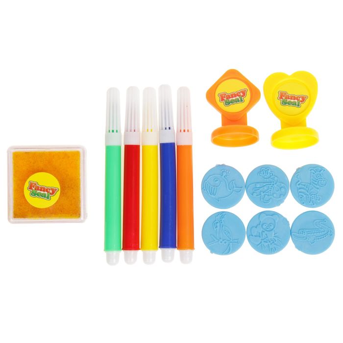 Набор печатей "Животные": печати 2 шт., оттиски 6 шт., раскраска, 5 фломастеров, штемпельная подушечка