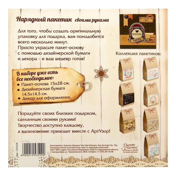 Набор для создания подарочного пакета своими руками порадует любителей творчества! На то, чтобы сделать оригинальную упаковку, вам понадобится всего несколько минут. Украсьте пакет-основу декором и дизайнерской бумагой, и ваш шедевр — готов!