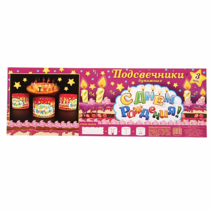 Декоративный бумажный подсвечник — простой и оригинальный сувенир, который обязательно порадует своего обладателя. Набор подсвечников "С днем рождения!" тортик, 3 шт. привнесёт частичку красоты, тепла и уюта в любой интерьер. При свете дня яркий конус будет выполнять функцию декоративной подставки или корзинки, а в темноте поставьте в него свечу и создайте волшебное мягкое свечение.