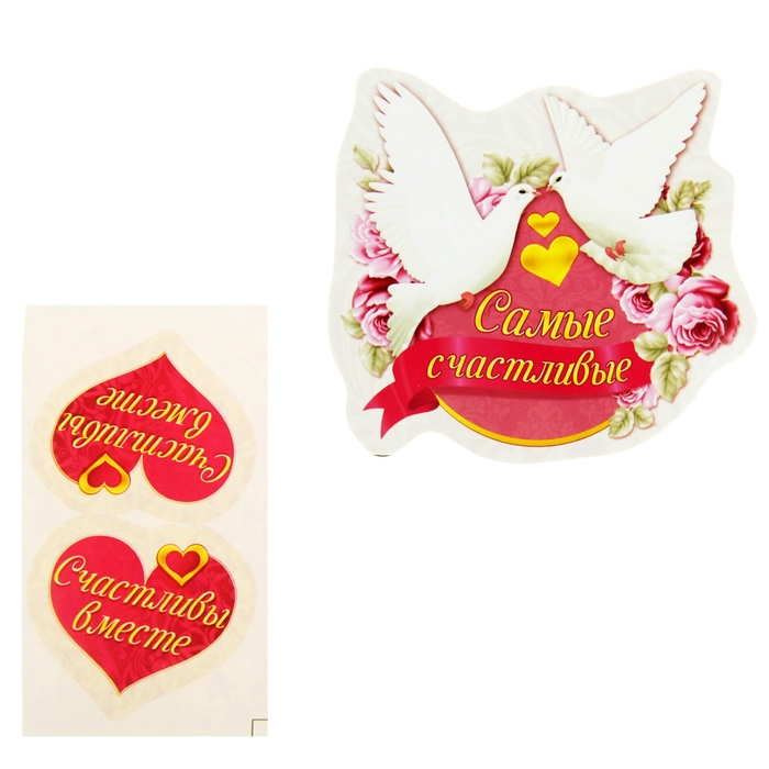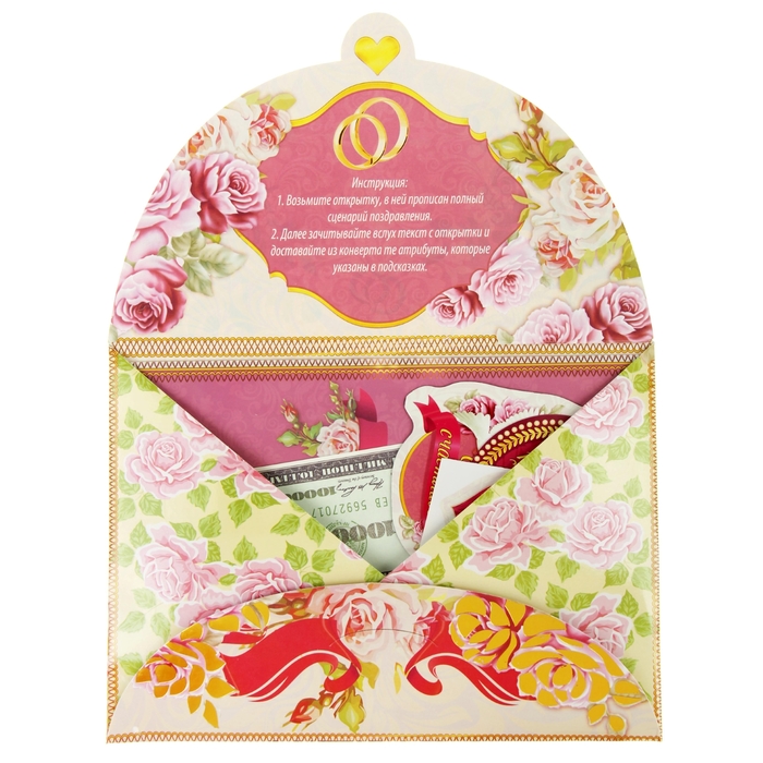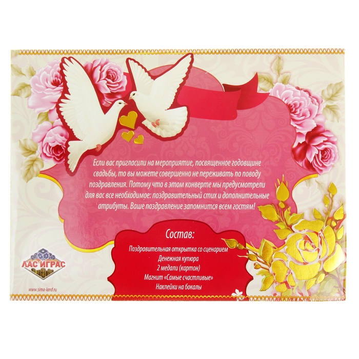 В конверте вы найдете открытку с мини-сценарием поздравления, а также дополнительные атрибуты – медали, магнит «Самые счастливые» и другие, необходимые для поздравления, реквизиты. Зачитывайте слова с открытки и доставайте из конверта те компоненты, которые указаны в подсказках, и ваше поздравление всех невероятно удивит своей оригинальностью!