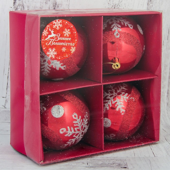 Набор шаров пластик d-7,5 см 4 шт "Сюрприз" снежинка красный