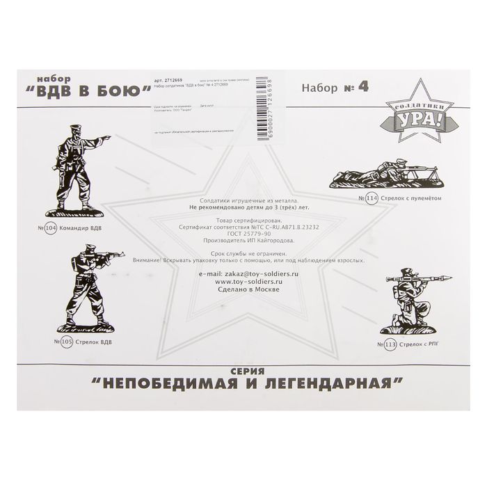 Набор солдатиков "ВДВ в бою" № 4 — сувенир в полном смысле этого слова. И главная его задача — хранить воспоминание о месте, где вы побывали, или о том человеке, который подарил данный предмет. Преподнесите эту вещь своему другу, и она станет достойным украшением его дома.