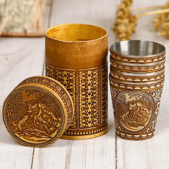 От качества посуды зависит не только вкус еды, но и здоровье человека. Набор стопок «Схватка с медведем», в футляре, 4 шт, береста, металл — товар, соответствующий российским стандартам качества. Любой хозяйке будет приятно держать его в руках. С нашей посудой и кухонной утварью приготовление еды и сервировка стола превратятся в настоящий праздник.