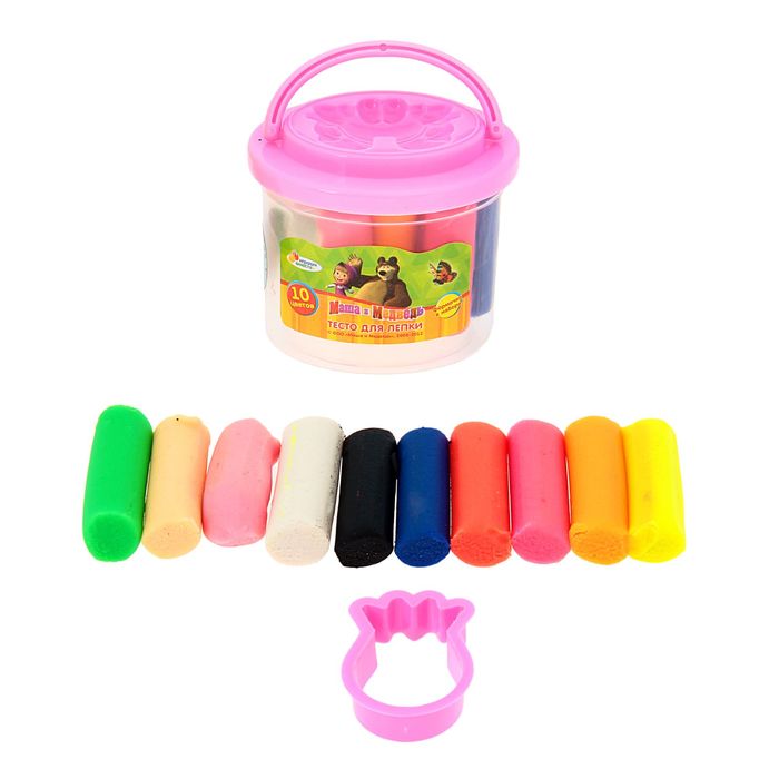С помощью формочки можно делать разнообразные фигуры и узоры, а 10 ярких цветов позволят потренироваться в смешивании новых оттенков. Удобное ведёрко с Машей и Медведем пригодится для хранения набора и убережёт материал от высыхания.