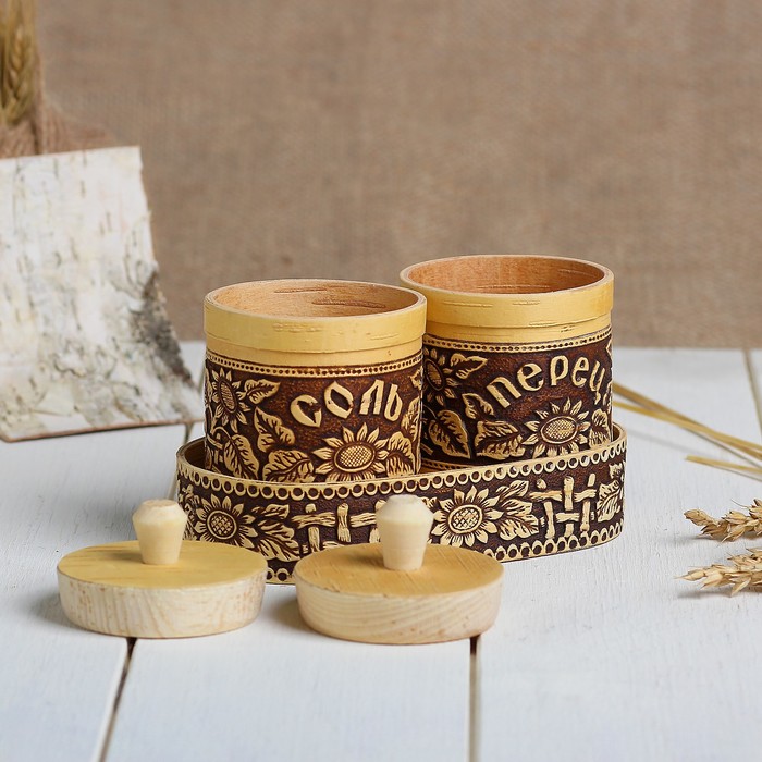 Набор туесов «Подсолнухи», подставка 14×7×3 см, туес 6,5×6.5×9 см, береста