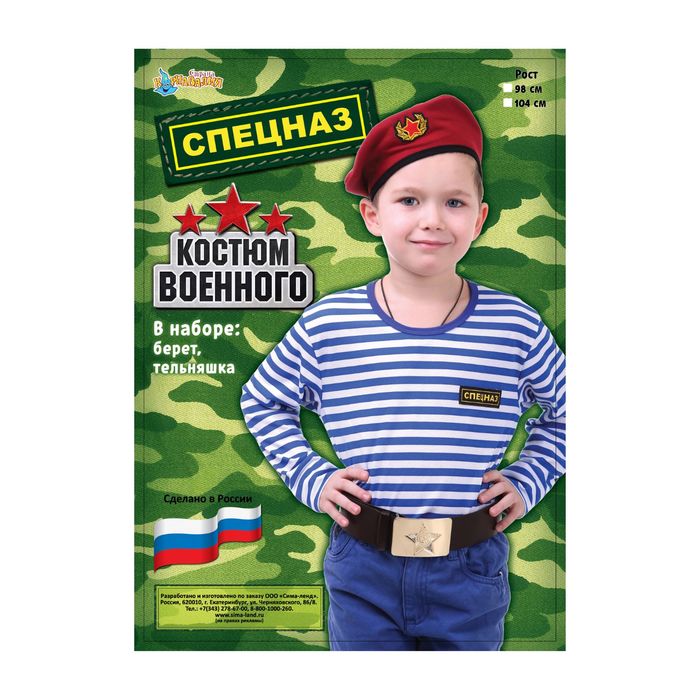 Набор военного "Спецназ", рост 98 см превратит вашего ребёнка в храброго бойца, защитника Родины, который всегда на страже порядка. Он прекрасно подойдёт для 23 Февраля, Дня Победы, участия в театральных постановках, парадах и шествиях. В таком наряде мальчик будет выглядеть мужественно, а родители испытают гордость за подрастающего патриота!