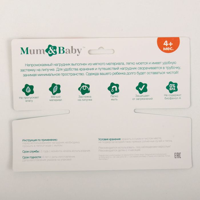 Непромокаемый нагрудник подходит для крошек, которые учатся кушать самостоятельно. Одежда останется сухой и чистой, а сам малыш сохранит опрятный и аккуратный вид после приёма пищи.