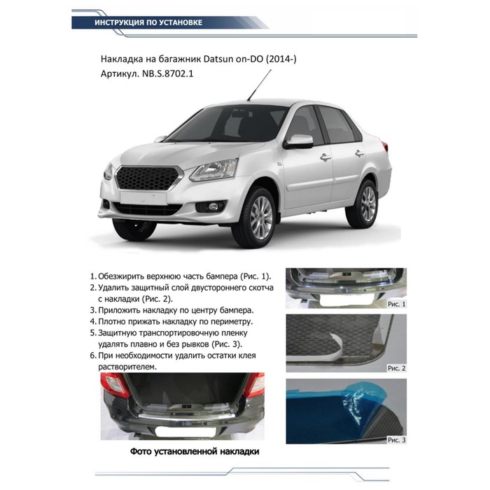 Не секрет, что машина давно уже перестала восприниматься как просто средство передвижения, и водители покупают всё лучшее для своих железных коней. Накладка на задний бампер Rival Datsun on-DO 2015-, нерж.сталь, 1 шт., NB.S.8702.1 — идеальный выбор, если вы ставите целью и улучшение технических характеристик, и поддержание внешнего вида автомобиля.