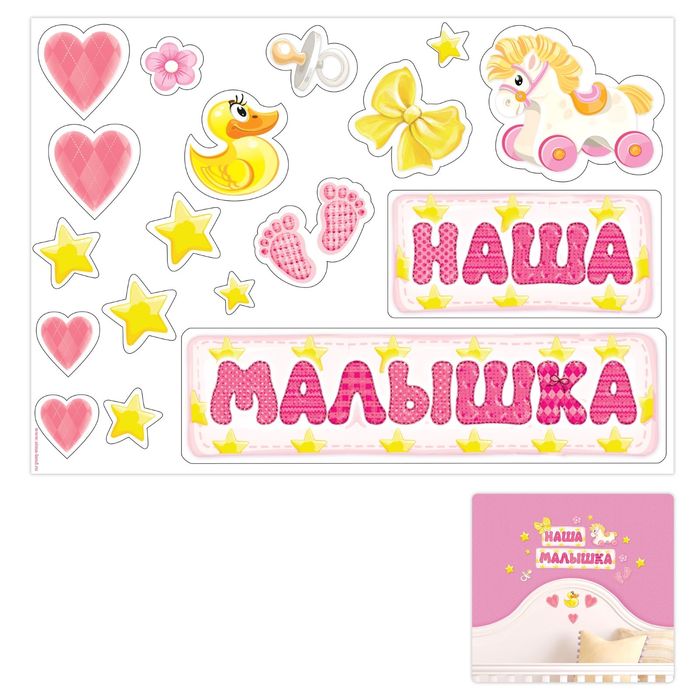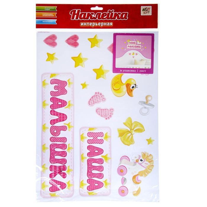 Наклейка интерьерная "Наша малышка" – лучший способ, не прибегая к дорогостоящему ремонту, украсить свой интерьер. Легким движением руки вы придадите ему индивидуальность и свой, неповторимый стиль. Размещайте наклейки где угодно: на стены, мебель, зеркала, потолок – в любое место, куда подскажет воображение. Комната вашего ребенка заиграет новыми красками, и ваш малыш будет чрезвычайно рад столь оригинальному преобразованию в своей комнате.