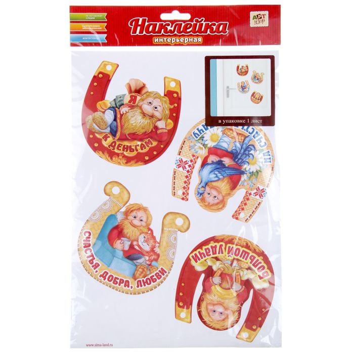 Наклейка интерьерная "Подковы с домовым" – лучший способ, не прибегая к дорогостоящему ремонту, украсить интерьер своей квартиры. Легким движением руки вы придадите ему индивидуальность и свой, неповторимый стиль. Размещайте наклейки где угодно: на стены, мебель, зеркала, потолок, холодильник и другую бытовую технику – в любое место, куда подскажет воображение. Квартира заиграет новыми красками, а домочадцы будут чрезвычайно рады столь оригинальному преобразованию. Наклейки-подковы принесут счастье и спокойствие вашему дому и наверняка сделают вашу жизнь лучше!