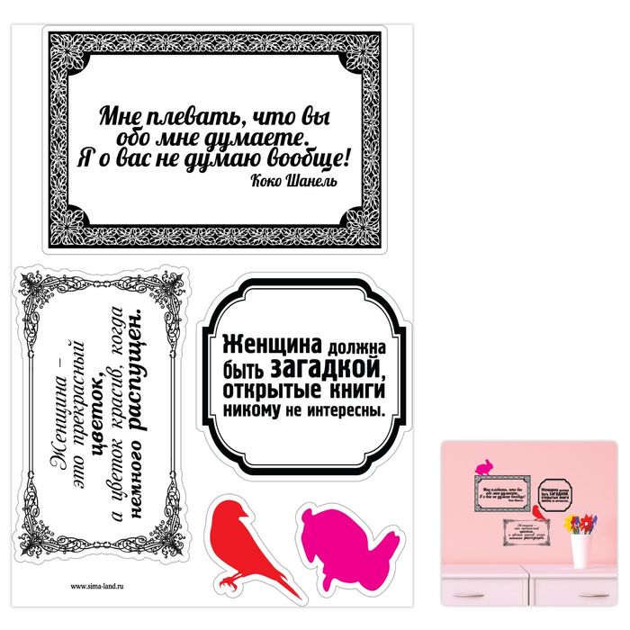 Наклейка интерьерная "Женщина должна быть загадкой" – лучший способ, не прибегая к дорогостоящему ремонту, украсить свой интерьер. Легким движением руки вы придадите ему индивидуальность и свой, неповторимый стиль. Размещайте наклейки где угодно: на стены, мебель, зеркала, потолок, холодильник и другую бытовую технику – в любое место, куда подскажет воображение. Квартира заиграет новыми красками, а домочадцы будут чрезвычайно рады столь оригинальному преобразованию. Жизненные выражения будут мотивировать на большие свершения и наверняка сделают вашу жизнь лучше!