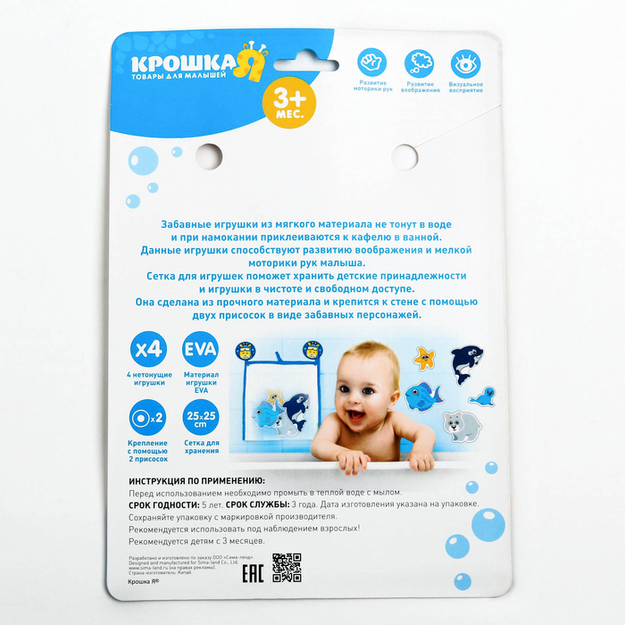 С набором игрушек ТМ «Крошка Я» малыш полюбит водные процедуры! Изделия выполнены из мягкого полимерного материала EVA (этиленвинилацетата). Они не тонут и быстро высыхают. При намокании объёмные фигурки легко приклеиваются к гладким поверхностям, например, к стенке ванной, кафелю или зеркалу.