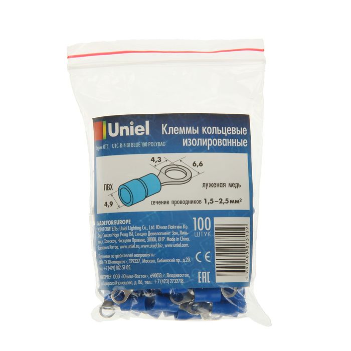 Наконечник кольцевой Uniel, изолированный, сечение 1.5 - 2.5 мм2, под винт М4, цвет синий