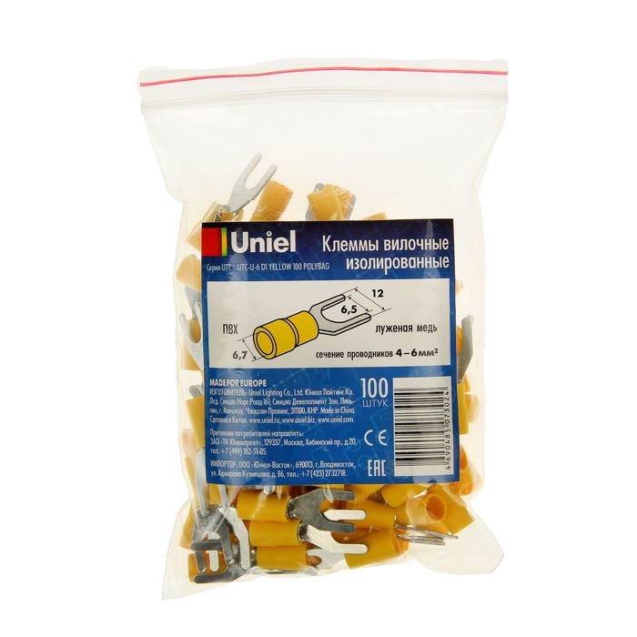 Наконечник вилочный Uniel, изолированный, сечение 4 - 6 мм2, под винт М6, цвет желтый