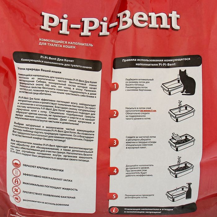 Натуральный комкующийся наполнитель, изготовленный из экологически чистой бентонитовой глины месторождения Сибири. Наполнитель впитывает большое количество влаги, образуя крепкие комки. На протяжении всего времени использования он эффективно нейтрализует неприятные запахи. «Pi-Pi-Bent для котят» позволяет вашему маленькому питомцу чувствовать себя ближе к природе!