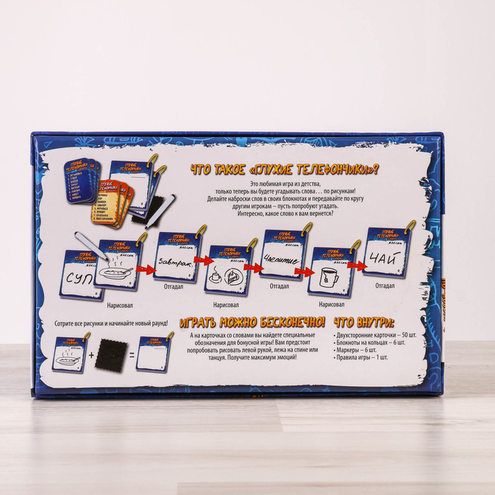 В удобных блокнотах! Страницы у них ламинированные, так что играть можно бесконечное число раундов. Рисуйте маркерами из набора, стирайте наброски и-и-и… начинайте новую игру!