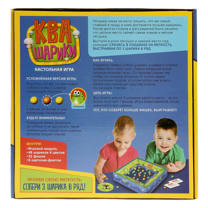 Представьте себя в роли лягушки и сразитесь за звание самого меткого. Цель — выстроить в пруду линию из трёх шариков одного цвета и получить фишку! Но бросать шарики нужно так, чтобы они отскочили от стола и лишь потом попали на игровое поле.