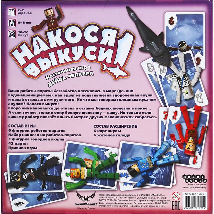 Настольная игра «Накося выкуси» — это увлекательное водное приключение, в которое отправятся бесстрашные роботы-пираты. Где-то на пути их подстерегает акула, но никто не знает, в какой именно момент она вынырнет. Тогда-то и нужно сказать: «Накося выкуси»!