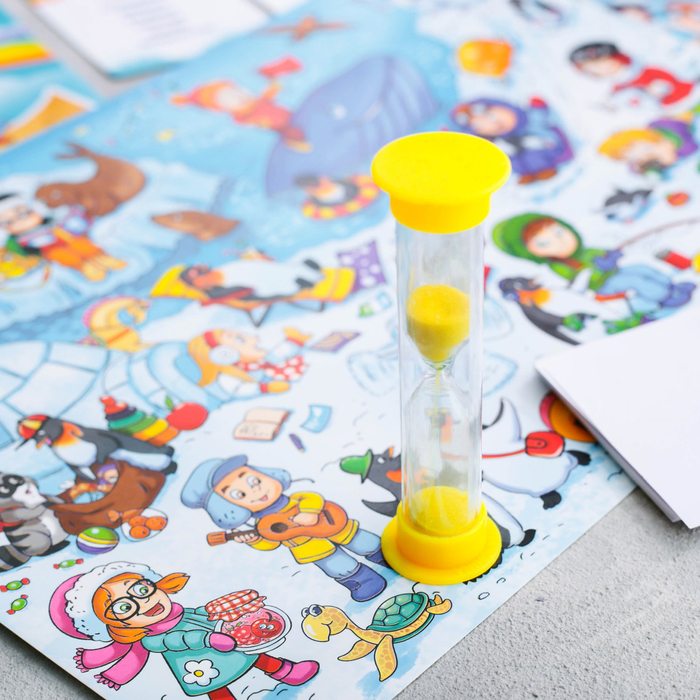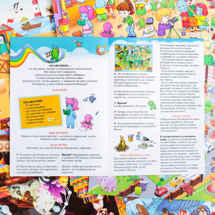 Правила игры объясняются за минуту. Раздайте всем игрокам листочки для записей и карандаши. Переворачивайте карту с иллюстрацией и засекайте 30 секунд. Пока бежит время в песочных часах, вам нужно записать на листочке как можно больше предметов, которые находятся на этой карте. А чем уникальнее будут слова, тем больше баллов вы сможете получить.
