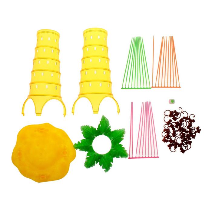 Вставьте в собранную прозрачную пальму цветные палочки через специальные отверстия. Высыпьте обезьянок внутрь дерева, где они зацепятся хвостами за ветки. Бросайте с другими игрокам по очереди кубик и осторожно вытаскивайте по одной соответствующей палочке из пальмы. Выиграет тот, у кого упадёт меньше всего обезьянок.