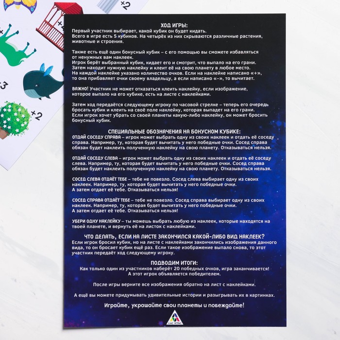 По очереди кидайте кубики, клейте на игровое поле изображения различных существ и растений. Каждое из них принесёт вам разное количество баллов. Как только один из участников наберёт 20 очков, игра заканчивается — он объявляется победителем. А ещё вы можете придумывать удивительные истории и разыгрывать их в картинках.
