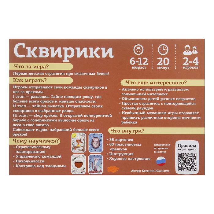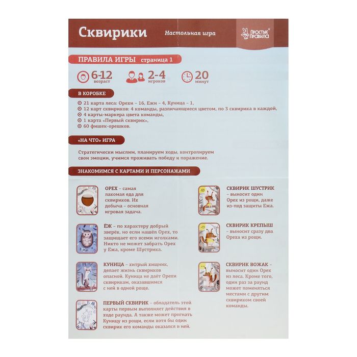 Скоро наступит зима. Маленькие сквирики начали готовиться к холодам и запасаться орехами. Но они не единственные, кто решил полакомиться. Забавные ёжики стараются раньше бельчат добраться до орехов, а вредная куница не даёт им собирать провиант. Помогите рыжим героям запастись едой до похолоданий и выжить в суровое время года в настольной игре «Сквирики».