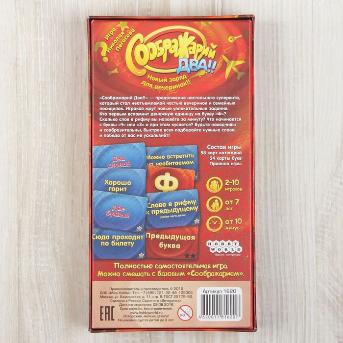 «Соображарий Два!!» — настольная карточная игра, в которой нужно наперегонки подбирать слова с определённой буквой на заданную тематику. Например, какая валюта начинается на «Ф»? Кто кусается на «Ч»? Вспоминайте примеры быстрее всех — победит самый сообразительный!