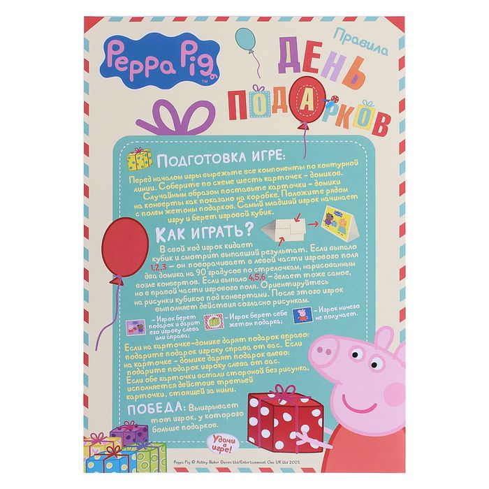 Невозможно представить нашу жизнь без праздников! Мы всегда ждём их и предвкушаем, обдумываем, как проведём памятный день, тщательно выбираем подарки и аксессуары, ведь именно они создают и поддерживают торжественный настрой. Настольная игра «Свинка Пеппа: День подарков» — это отличный выбор, который привнесёт атмосферу праздника в ваш дом!