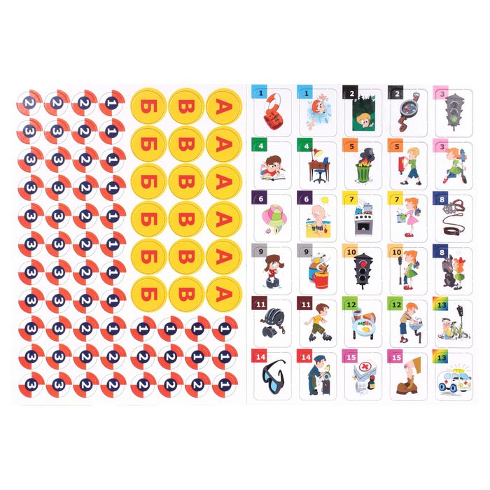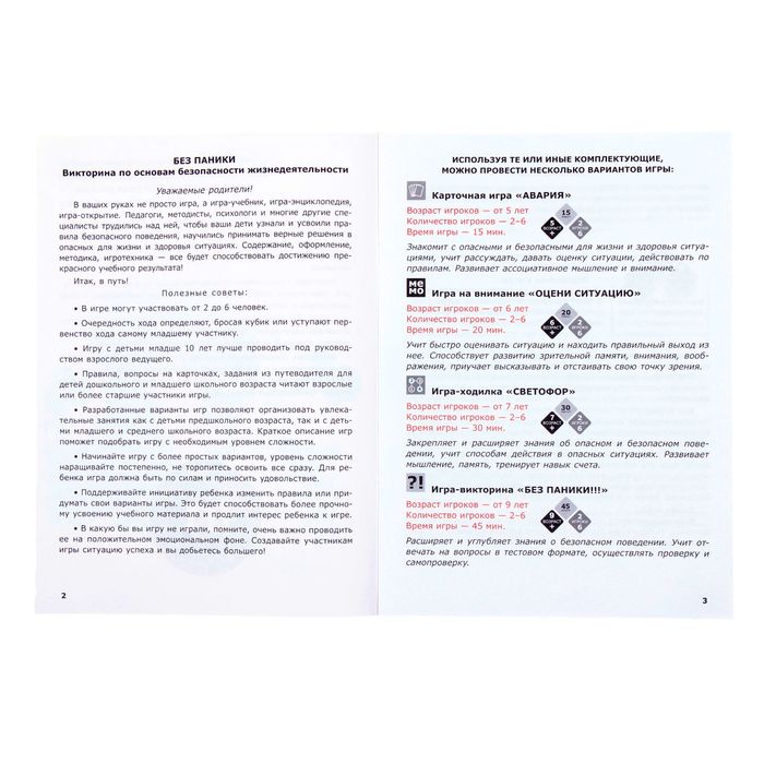 Разработчики включили в комплект сразу четыре различных игры. В викторине «Без паники» в формате вопрос-ответ дети научатся правильно вести себя в разных ситуациях. В ходилке «Светофор» малыши закрепят знания, полученные в предыдущей игре. С мемо-карточками «Оцени ситуацию» дети научатся быстро принимать решения. А в карточной игре «Авария» познакомятся с правилами дорожного движения.