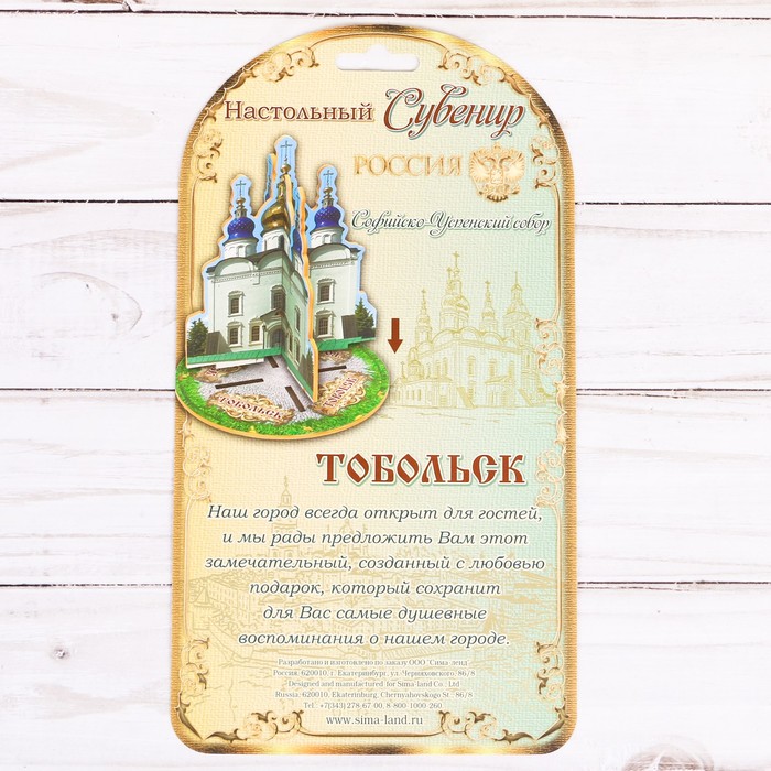 Сувенир посвящён Тобольску — величественному старинному городу, заложенному в 1587 году на пересечении легендарных рек Иртыша и Тобола. Издавна он считается центром духовной жизни края. Здесь находится единственный в Сибири каменный Кремль с великолепным Софийско-Успенским кафедральным собором.
