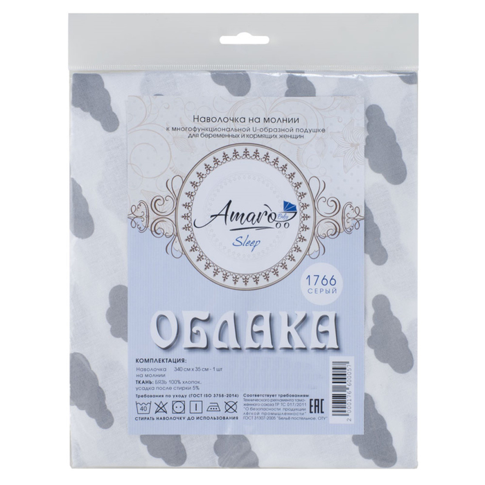 Наволчка к U-образной подушки для беременных, размер 34×170 см, облака серый