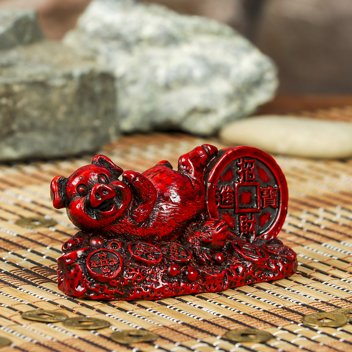Нэцке полистоун "Свинка с китайской монетой" тёмно-красный 4,5х8,5х4,2 см