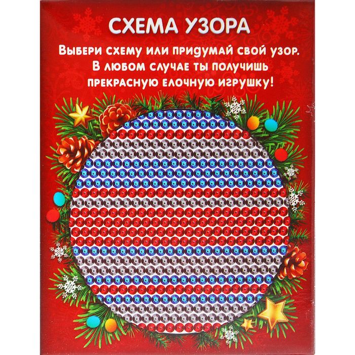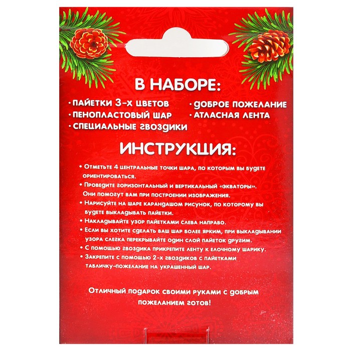 Прикрепите на пенопластовую основу шара пайетки при помощи специальных гвоздиков. К готовому новогоднему шару присоединяете яркую ленту. Сделанной поделкой украсьте праздничное дерево. Дополнительным бонусом в наборе будет маленькая открытка для поздравления.