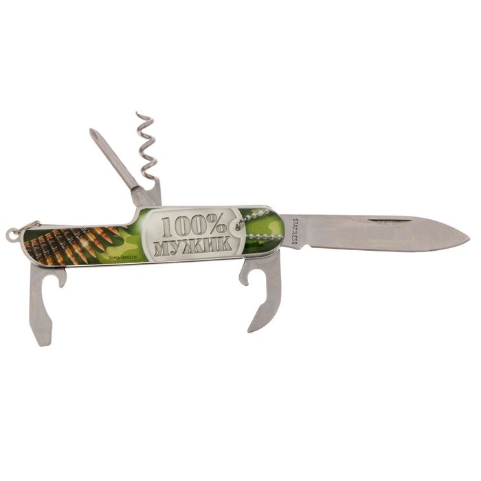 Многофункциональный нож — незаменимый помощник туриста, охотника и рыбака. При правильном обращении клинок из нержавеющей стали прослужит долгие годы. Изделие дополнено тематическими иллюстрациями, которые украшают ручку.