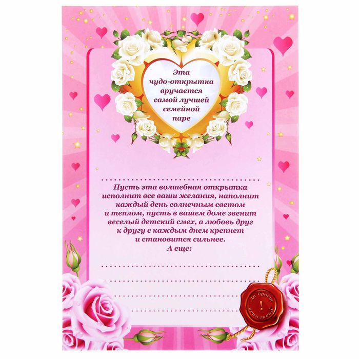 Подарив своим родным и близким чудо-открытку, вы удивитесь, как быстро сбудутся все мечты дорогих вам людей. В специальное поле вы можете вписать и своё пожелание для влюбленной пары! Но помните, с помощью этой открытки вы сможете подарить не только положительные эмоции, с ней дом наполнится счастьем, и в нём воцарится любовь!